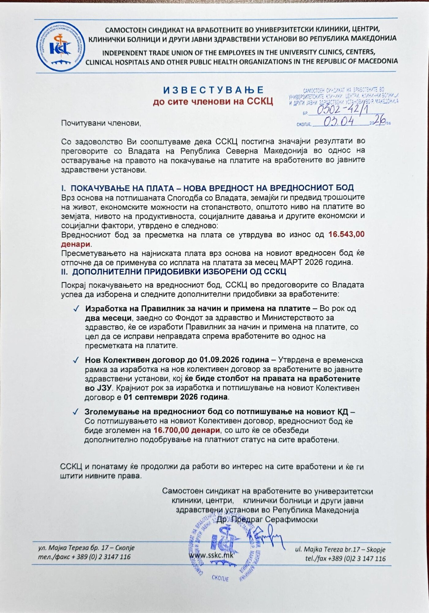 Со задоволство Ви соопштуваме дека ССКЦ постигна значајни резултати во преговорите со Владата на Република Северна Македонија во однос на остварување на правото на покачување на платите на вработените во јавните здравствени установи.